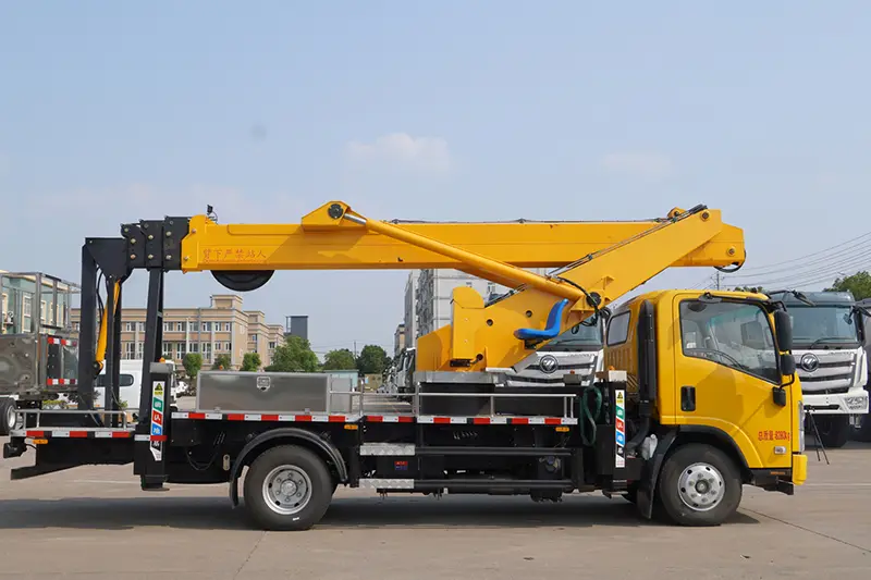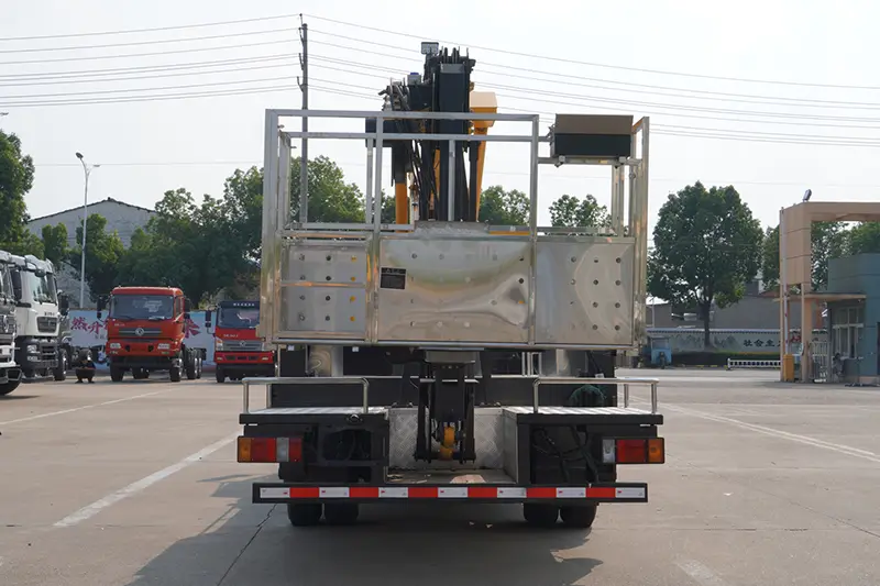 Tämä 22 metrin työlava-kuorma-auto on varustettu täydellä sarjalla turvajärjestelmiä käyttöturvallisuuden varmistamiseksi: ajoneuvon ylempi ja alempi lukituslaite, sähköinen hätähydraulipumppu, kaksisuuntainen hydraulinen lukko ja tasapainoventtiili puomin vahingossa putoamisen estämiseksi; ajoneuvon tasomittari reaaliaikaiseen kallistuksen valvontaan kaatumisriskin välttämiseksi; tasatilavuuksinen sylinterien vaaitusjärjestelmä automaattista tasoa varten; älykäs kuormitusta rajoittava ja vaarallisen toiminnan hälytysjärjestelmä sekä tiukka tehdasdynaaminen ja staattinen kuormitustestaus, mikä takaa täydellisen turvallisuuden kaikissa työolosuhteissa.
